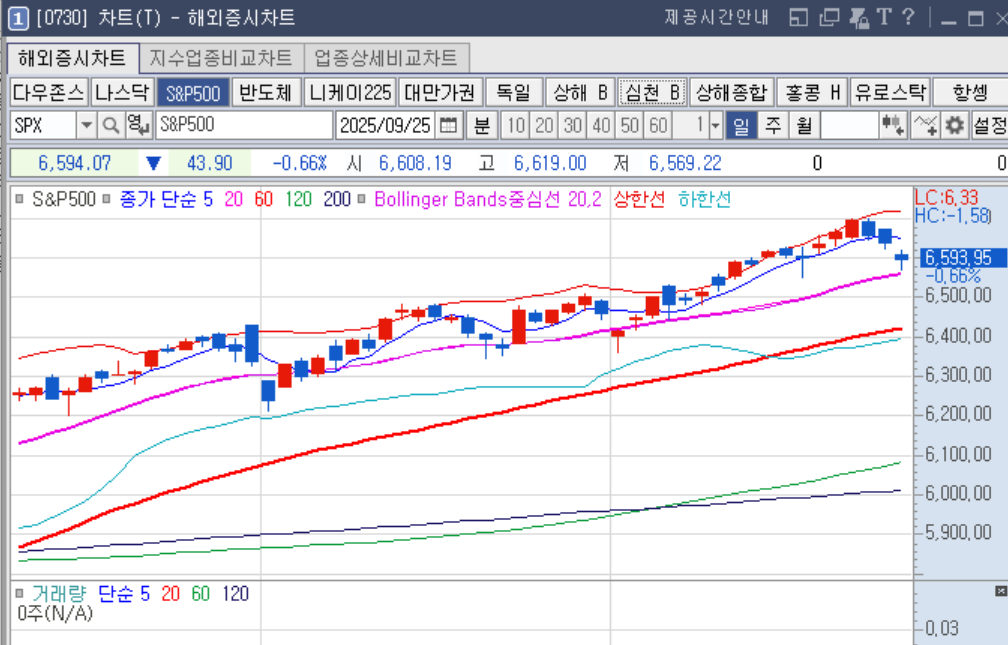 미국 3대 지수는 모두 하락 마감했다. 숨죽이고 있다가 금리 인하 가능성이 떨어지자 하락하는 것으로 보인다. 이재명 대통령은 미국 일정을 소화중에 있는데, 오늘은 증권 거래소에 가서 한국 투자를 열심히 외쳤다고 한다. 해외 투자가들이 한국 시장 진입에 겪는 어려움을 직접 듣고 이를 해소하겠다는 의지를 강하게 보였다. 미국 10년물 국채 금리와 달러 인덱스는 아주 살짝 고개를 드는 모습이다.