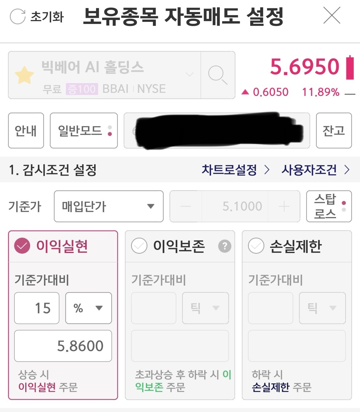 원칙에 따라, 빅베어AI가 15% 상승을 보여주어 절반 매도를 진행했다. 강한 상승이 나오는 경우 아쉬운 마음이 지속적으로 드는 건 마찬가지이기에, 오늘을 기점으로 원칙을 약간 변경해보려 한다. 감시 주문을 활용하였다.