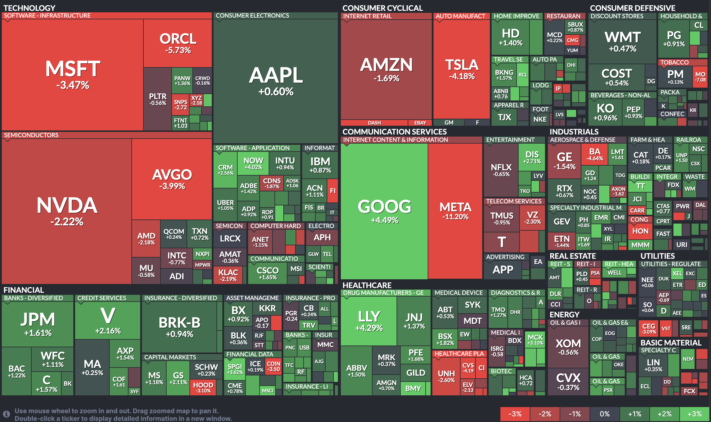 - 빅테크 하락 : 하락하는 중이다. 실적 시즌이고, 실적이 호조를 기록했음에도 하락하는 모습을 보이는데, 이를 두고 일각에서는 AI 단기 조정이 불가피한 시점에 이르렀다고 판단하고 있다. 특히 M7 중 메타, 아마존, 구글이 실적 발표를 어제 장 마감 이후에 했는데, 세 기업의 공격적인 AI 투자가 눈에 보였지만, 가시적인 실적 전환은 알파벳(구글)이 강한 모습을 보였기에, 오늘 장 중엔 아마존과 메타는 큰 폭으로 하락 중에 있고 구글은 상승하고 있는 모습이다.